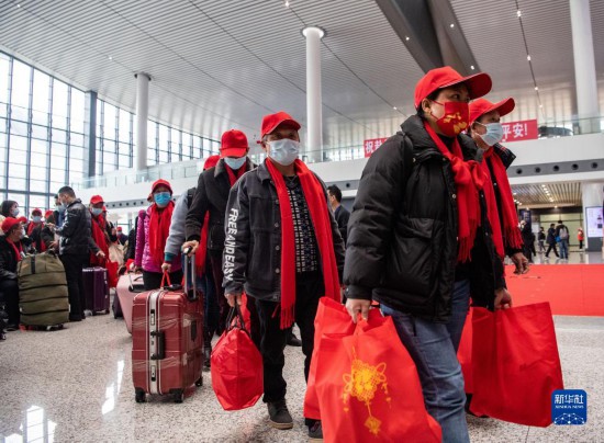 2月16日,返崗務(wù)工人員在重慶西站候車廳排隊前往檢票口,免費乘坐復(fù)工專列前往廣東省返崗務(wù)工。新華社記者 唐奕 攝